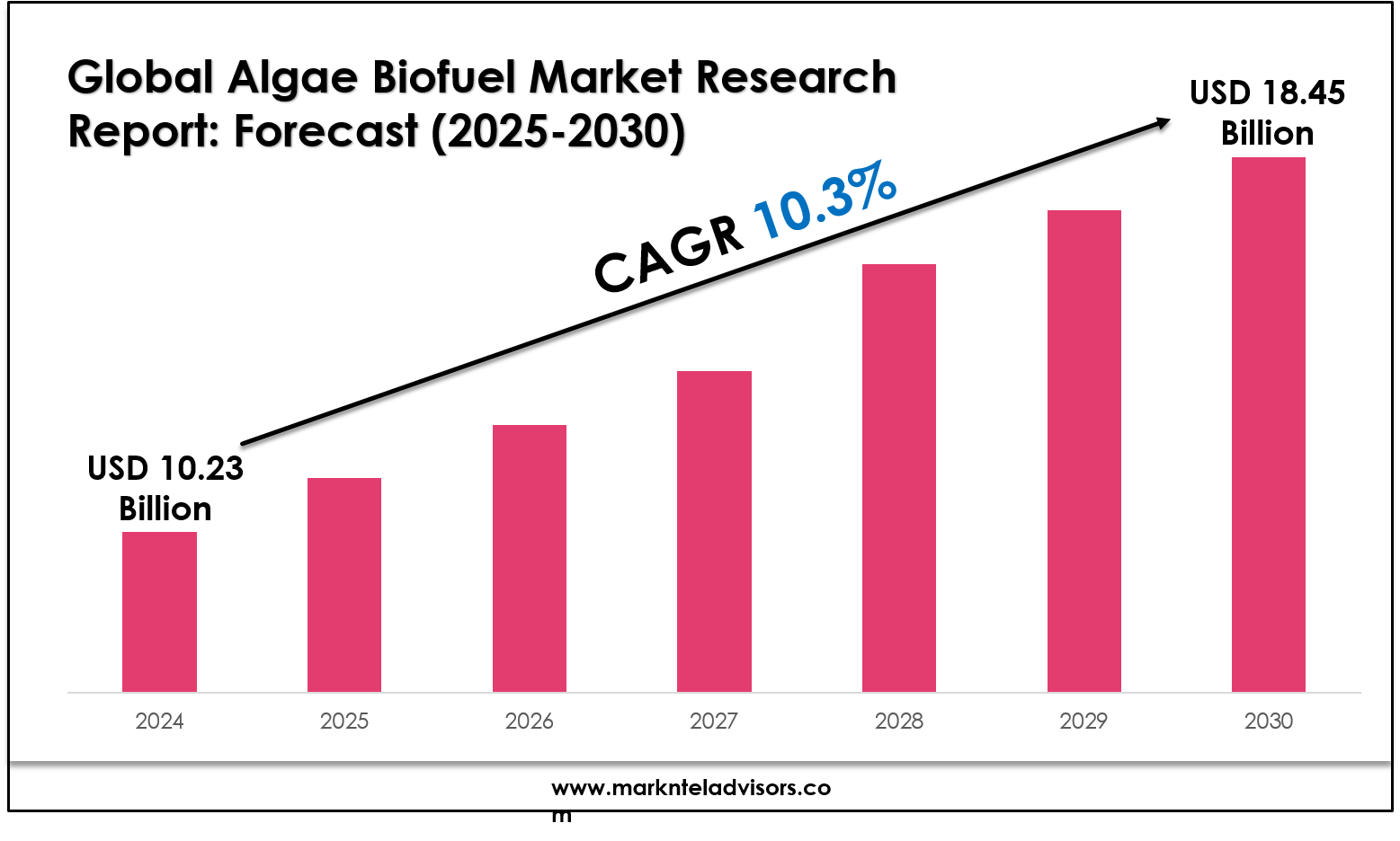 The Global Algae Biofuel Market is projected to experience substantial growth between 2025 and 2030, driven by digital transformation, innovation in service delivery, and expanding demand. The Global Algae Biofuel Market size was valued at around USD 10.23 billion in 2024 and is projected to reach USD 18.45 billion by 2030. The market is also estimated to grow at a CAGR of around 10.3% during the forecast period, i.e., 2025-30. This report offers an in-depth analysis of the key drivers, challenges, competitive landscape, and future outlook — helping businesses, investors, and stakeholders make informed decisions.