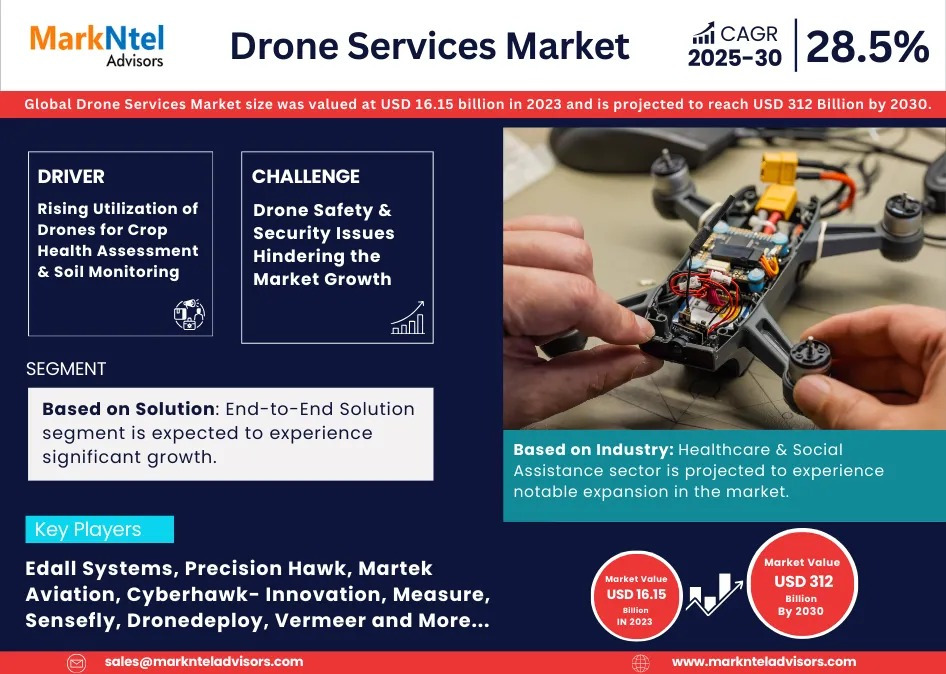MarkNtel Advisors has unveiled its latest research report on the Drone Services Market, providing an in-depth analysis of market dynamics, growth prospects, and competitive landscape. This report serves as a valuable resource for stakeholders aiming to capitalize on emerging opportunities and navigate potential challenges in the Drone Services industry.