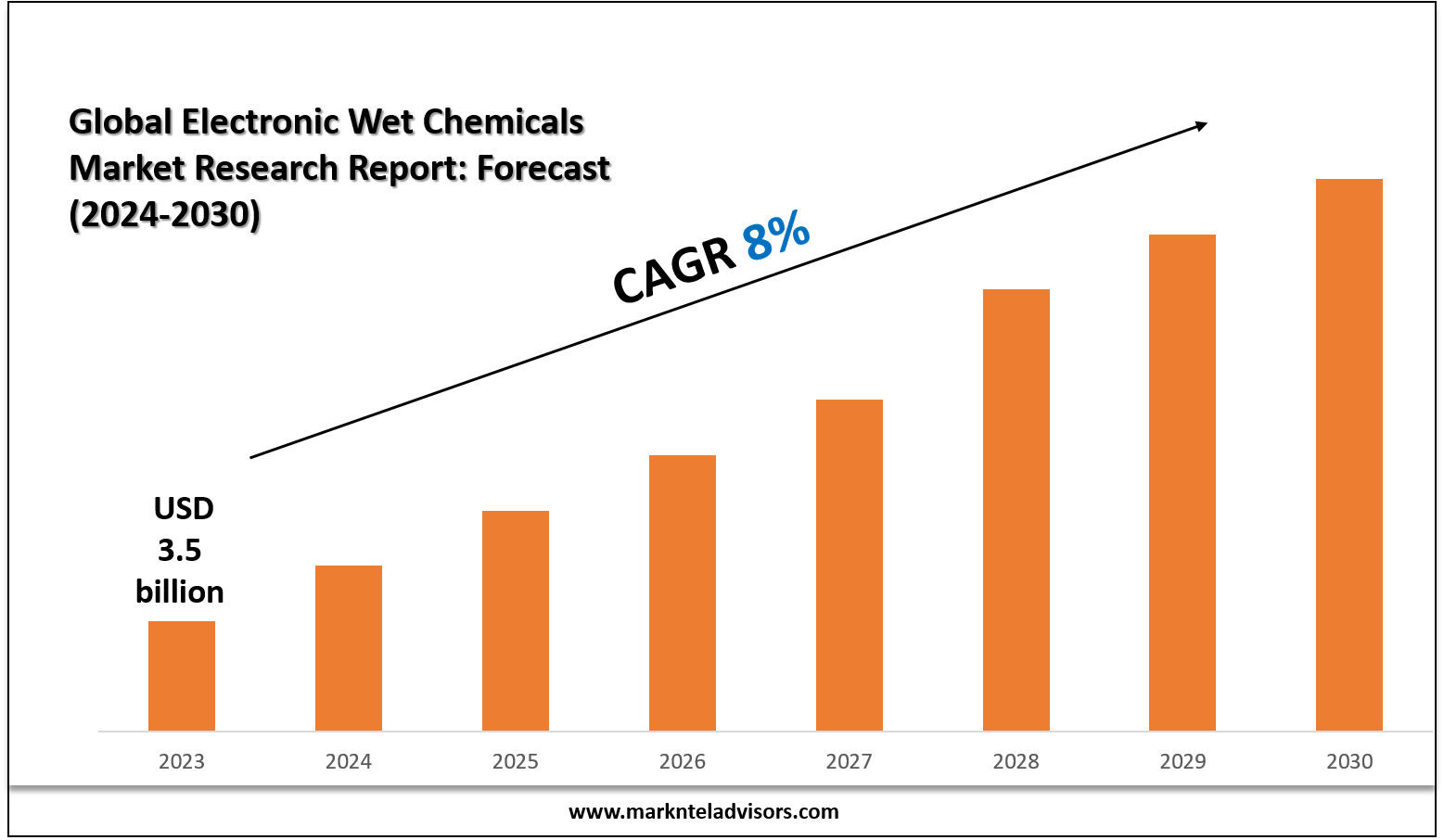 The Global Electronic Wet Chemicals Market size was valued at around USD 3.5 billion in 2023 and is estimated to grow at a CAGR of around 8% during the forecast period, i.e., 2024-30.