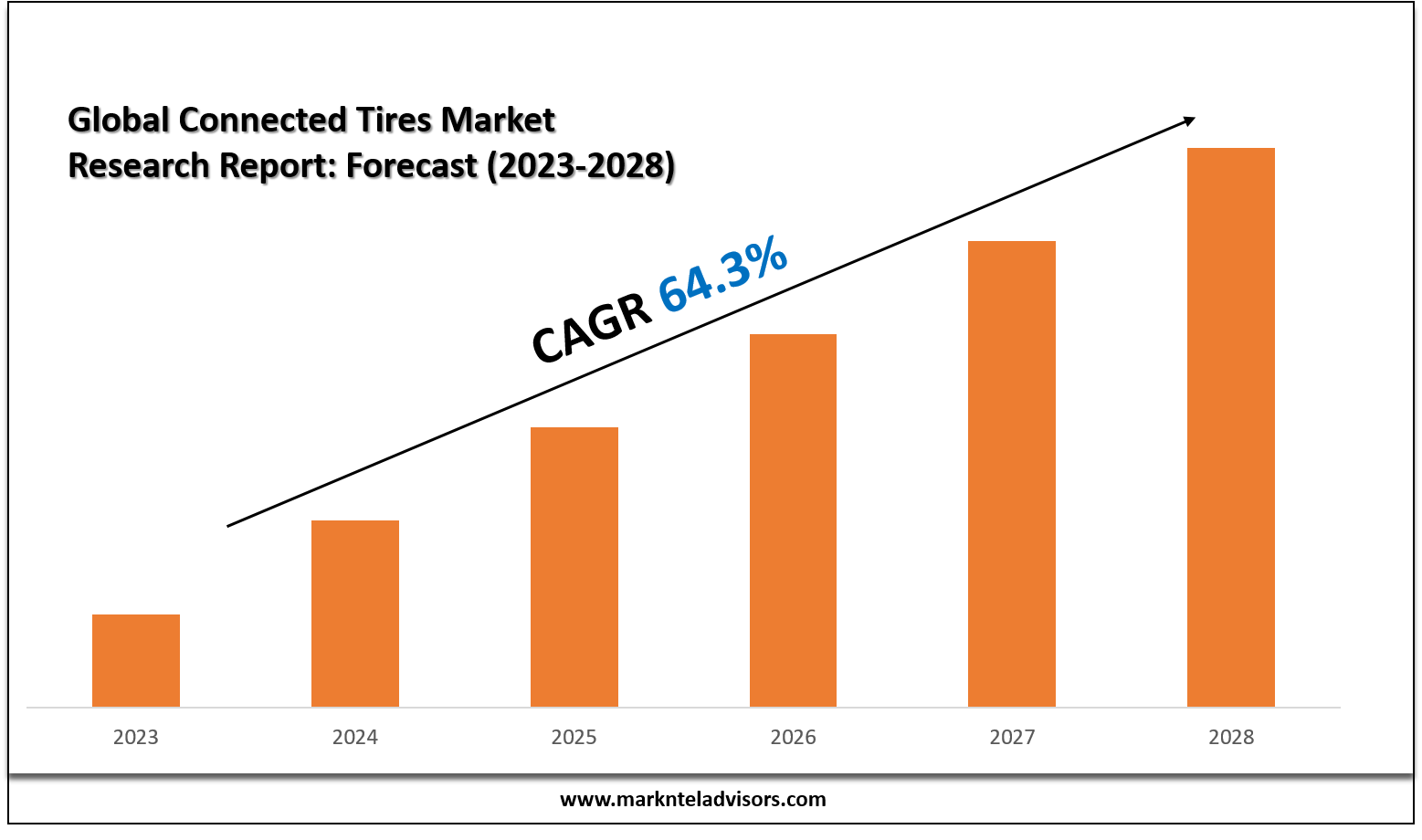 The Global Connected Tires Market is projected to grow at a CAGR of around 64.3% during the forecast period, i.e., 2023-28.