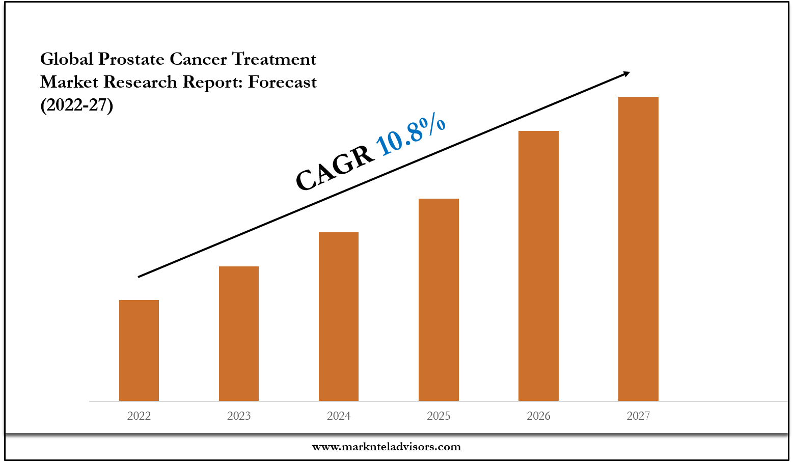 The Global Prostate Cancer Market is projected to grow at a CAGR of around 10.8% during the forecast period, i.e., 2022-27.