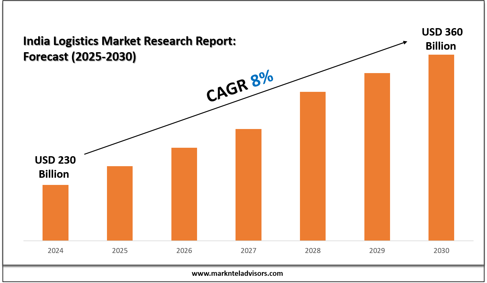 The India Logistics Market size was valued at around USD 230 billion in 2024 and is projected to reach USD 360 billion by 2030. Along with this, the market is estimated to grow at a CAGR of around 8% during the forecast period, i.e., 2025-30.