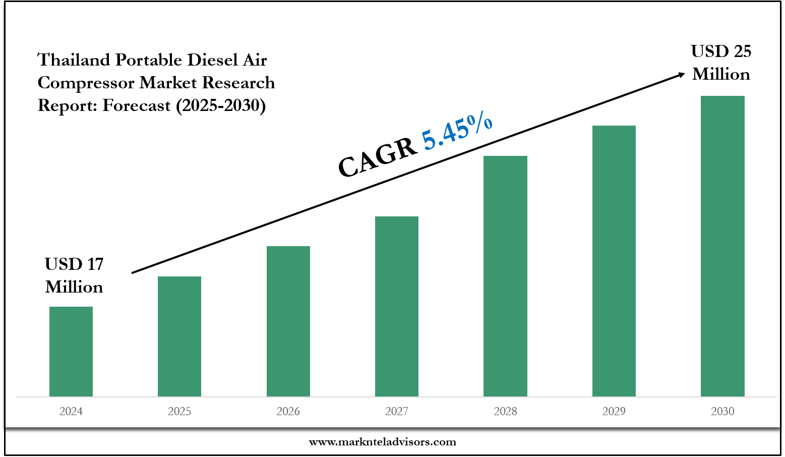 The Thailand Portable Diesel Air Compressor Market size was valued at around USD 17 million in 2024 and is projected to reach USD 25 million by 2030. It is also estimated to grow at a CAGR of around 5.45% during the forecast period, 2025-30.