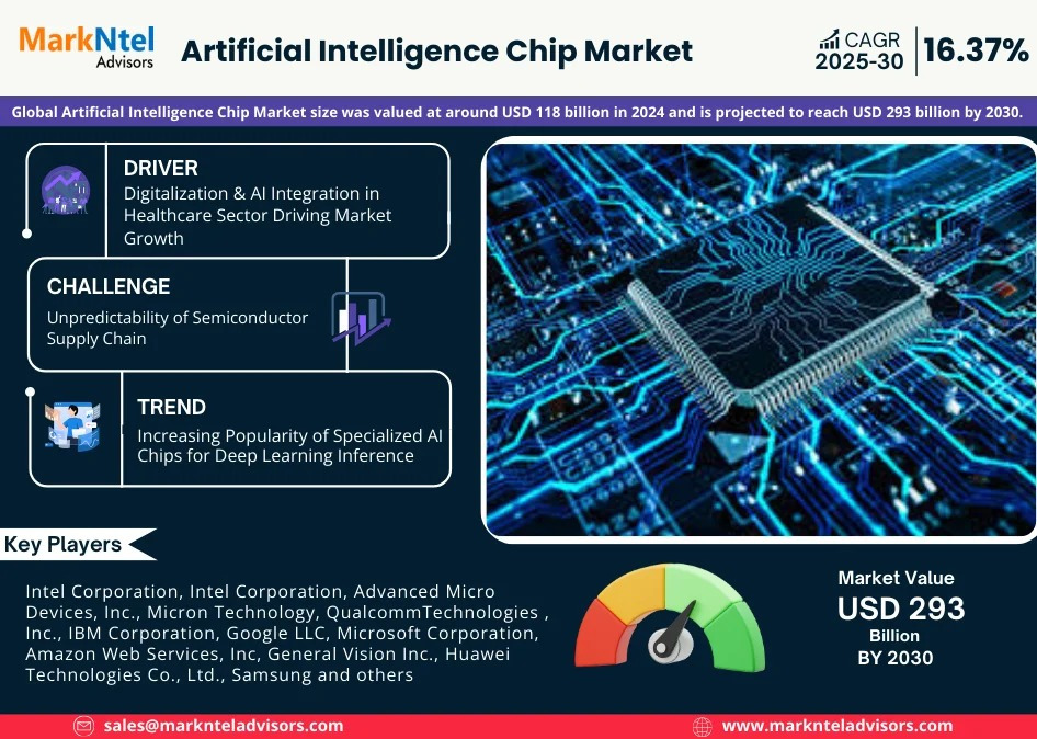 The Global Artificial Intelligence Chip Market size was valued at around USD 118 billion in 2024 and is projected to reach USD 293 billion by 2030. Along with this, the market is estimated to grow at a CAGR of around 16.37% during the forecast period, i.e., 2025-30.